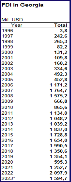 (National Statistics Office of Georgia. Foreign Direct Investments in Georgia for 1996-2023)