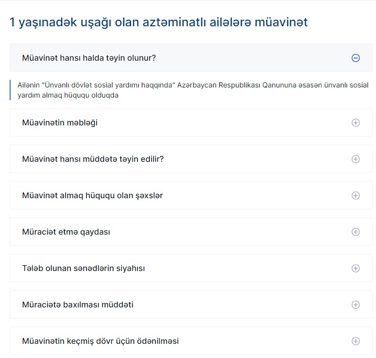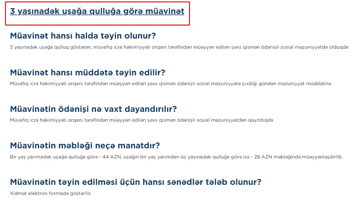 3) 3 yaşınadək uşağa qulluğa görə aylıq müavinət növü vardır. Bir yaş yarımadək uşağa qulluğa görə 44 manat, uşağın bir yaş yarımdan üç yaşınadək qulluğa görə isə 28 manat məbləğində müəyyənləşdirlib.