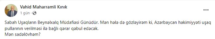 Sosial mediada Azərbaycanda “uşaqpulu” mövzusunda müzakirələr, iddialar davamlı şəkildə yayılmaqdadır. Bəzi ekspertlər iddia edirlər ki, ölkəmizdə dövlətin uşaqlara sosial qayğısı çox aşağı səviyyədədir, dövlət büdcəsindən uşaqların sosial müdafiəsi, təminatı ilə bağlı vəsaitlərin məbləği yetərsiz həcmlərdədir. Onlardan biri Vahid Məhərrəmli iddia edir ki, Azərbaycan hakimiyyəti indiyə qədər uşaq pulların verilməsi ilə bağlı qərar qəbul etməyib.