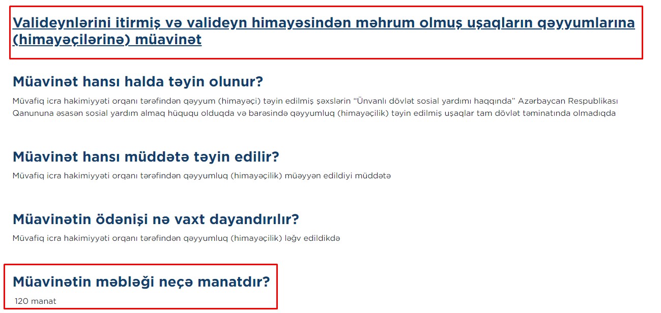 5) Valideynlərini itirmiş və valideyn himayəsindən məhrum olmuş uşaqların qəyyumlarına (himayəçilərinə) müavinətin məbləği də 120 manat təşkil edir.
