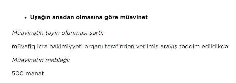 1)Hazırda ölkəmizdə uşağın anadan olmasına görə 200 manat birdəfəlik müavinət verilir, ötən il ölkəmizdə həyata keçirilən 4-cü sosial paketin icrasından sonra bu müavinətin məbləği 500 manata çatdırılıb. mənbə