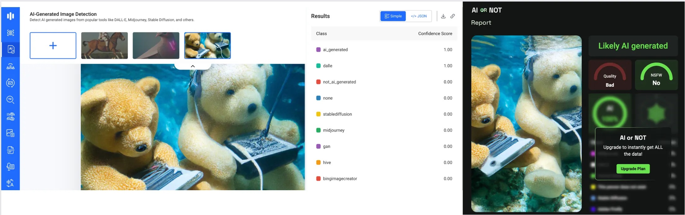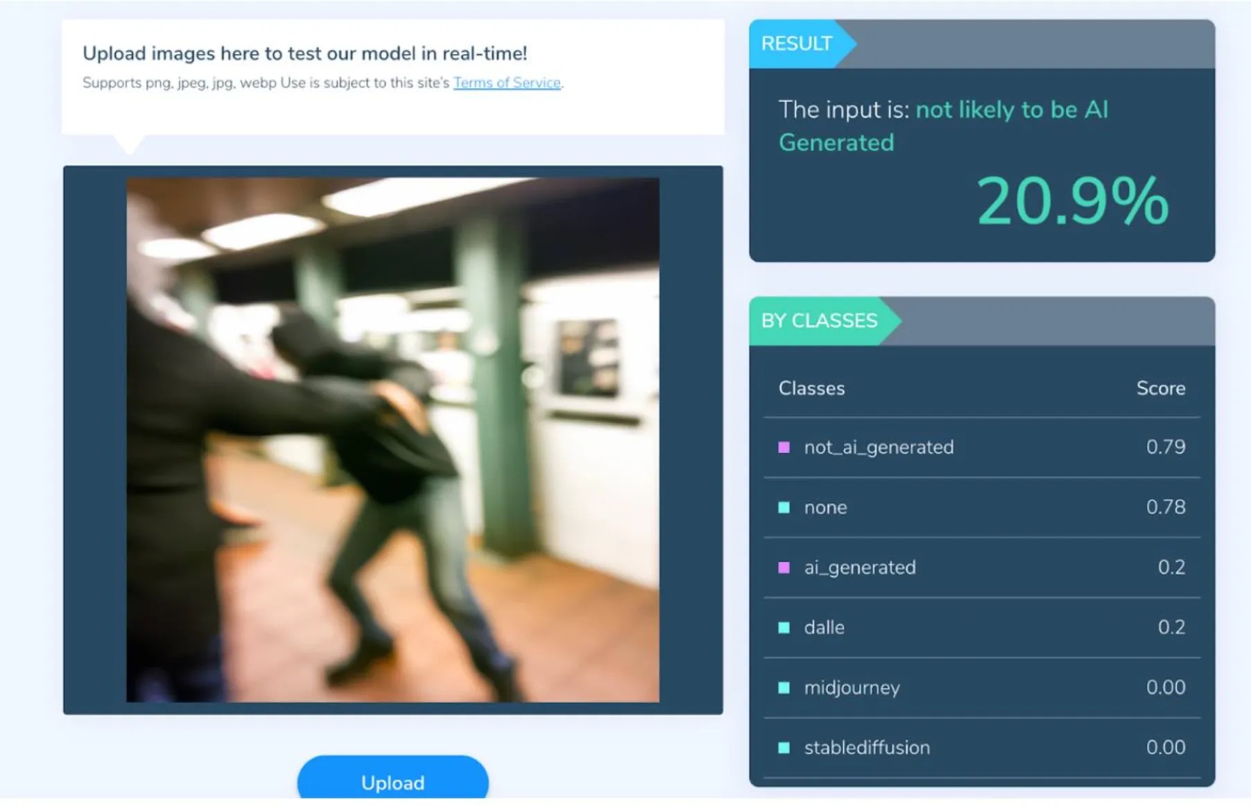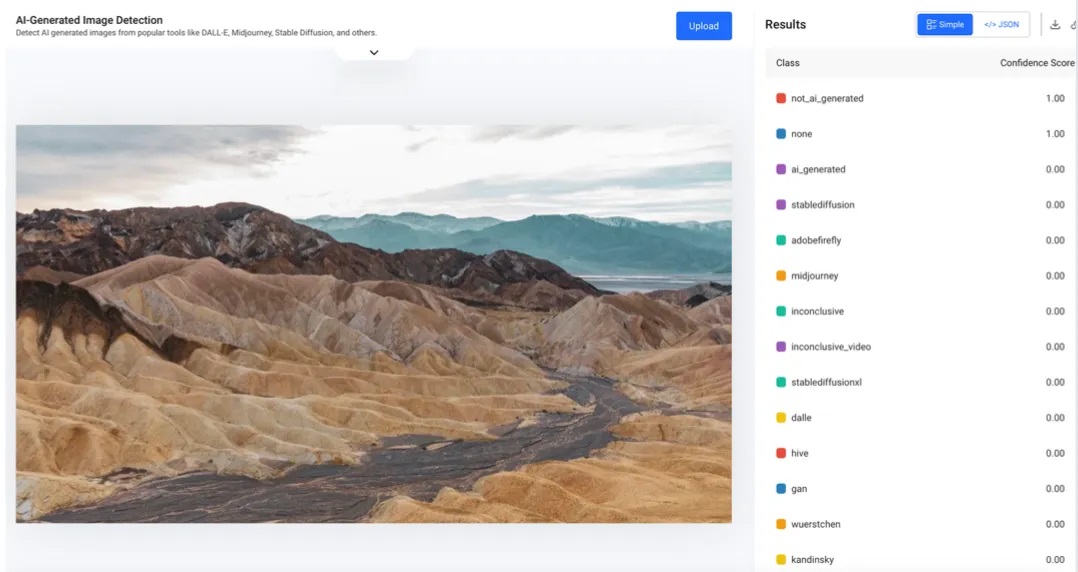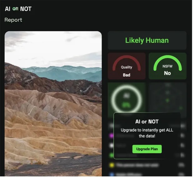 Məsələn, “Hive Moderation”da təsvirin süni intellekt tərəfindən hazırlanacağını göstərən bəzi etiketlər var. Bununla belə, nəticə sıralamasındakı 1 və 0 dəyərləri istifadəçilər üçün çox da anlaşılan olmaya bilər. Eyni şəkil AI və ya “Not” alətinə yükləndikdə, nəticə "ehtimal ki, süni intellekt tərəfindən istehsal edilmişdir" xəbərdarlığı ilə görünür.