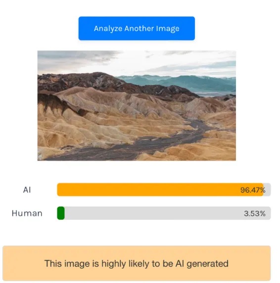 Məsələn, Kaliforniyada çəkilmiş bu foto üçün 3 fərqli alətdən 3 fərqli nəticə əldə edilib: “isitait” adlı alət görüntünün süni intellekt tərəfindən hazırlandığı nəticəsinə gəlib.