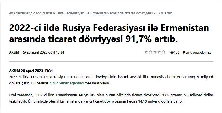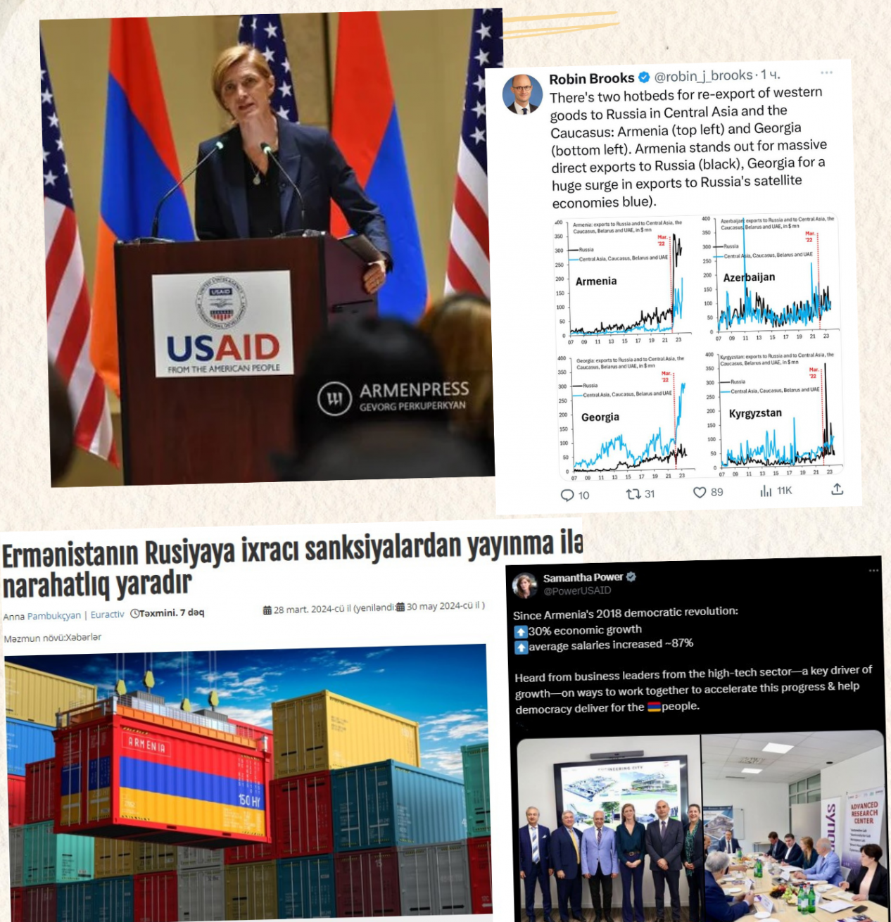 - Ermənistanda orta aylıq əməkhaqqının 87 faiz, iqtisadiyyatın 30 faiz artması milli iqtisadi inkişaf və yerli resurslar hesabına deyil, ABŞ və Aİ-nin sankisyalarından yayınmaqla Rusiyaya re-eksport nəticəsində baş verib;