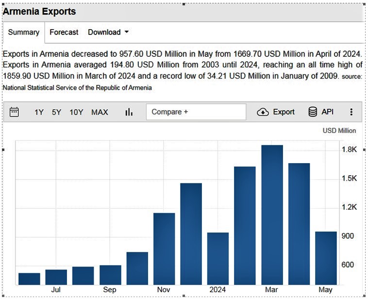 Ermənistan re-eksport dinamikasını 2024-cü ildə də sürətlə davam etdirib, yanvar-may aylarında rəqəmlər bir qədər də böyüyüb, hətta mart ayında Ermənistanda misli görünməmiş dərəcədə - 1,86 milyard dollar həcmində mal ixracı qeydə alınıb. istinad