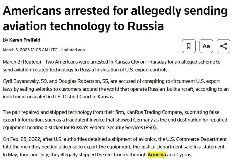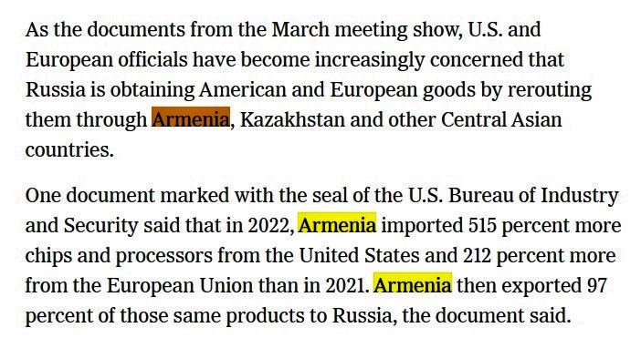 “The New York Times”da ötən il dərc edilmiş məqalədə Ermənistan 2022-ci ildə ABŞ və Avropa İttifaqından çip və prosessor idxalının 5 dəfə artdırılması və həmin məhsulların 97 faizinin Rusiyaya re-eksport edildiyi bildirilir. istinad