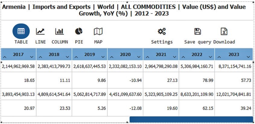 Cəmi 2 ildə bu ölkənin ümumi ticarət dövriyyəsinin həcmi 8,2 milyard dollardan 20,4 milyard dollara yüksəlməsi, ələlxüsus da Ermənistanın istehsal etdiyi mal və xidmətlərin həcmində 4-5 faiz artımlar olduğu halda birdən-birə 2 il ərzində ixracın 2,9 milyard dollardan 8,4 milyard dollara qədər böyüməsi əsaslı şübhələri dərinləşdirir. Ölkədə ixracın arxasında dayanan resurslar olmadığı halda əlavə olaraq 5,5 milyard dollar dəyərində mal və məhsulun haradan və necə ortaya çıxması da çox maraqlıdır.