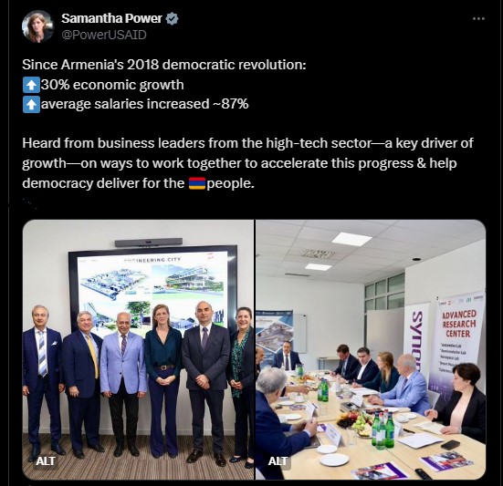 ABŞ Beynəlxalq İnkişaf Agentliyinin (USAID) rəhbəri Samanta Pauer Ermənistanda səfərdə olarkən dövlət və biznes nümayəndələri ilə görüşdən sonra belə bir açıqlama ilə çıxış edib ki, Paşinyan hakimiyyətə gələndən sonra ölkədə aparılan demokratik iqtisadi islahatlar, azad iqtisadiyyat quruculuğu sayəsində iqtisadiyyat 30 faiz, maaşlar isə 87 faiz artıb.