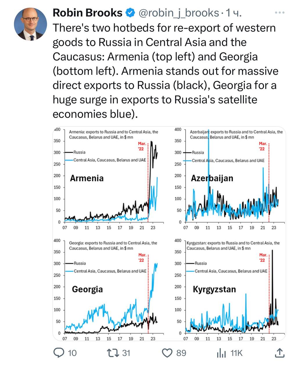 Bir müddət əvvəl məşhur maliyyə tədqiqatçısı,“Goldman Sachs” iqtisadi analitika mərkəzinin baş strateqi və Beynəlxalq Maliyyə İnstitunun baş iqtisadçısı Robin Bruks da Ermənistanın 2023-cü ildəki süni böyüyən 8,4 milyard dollarlıq saxta ixracının mahiyyətini əsl peşəkar mütəxəssis dəqiqliyi ilə şərh etmişdir.