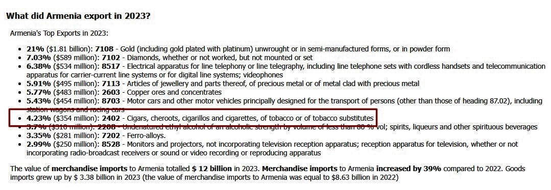 Ermənistanın Rusiyaya ixrac etdiyi malların böyük qismi, ən azı 70 faizi yerli mallar deyil. Belə ki, 2023-cü ildə Ermənistandan ixracın strukturunda təbii və mineral maddələrin, qiymətli daş və metalların, onlardan hazırlanmış məmulatların dəyəri 3,2 milyard dollar (38%) təşkil edib. Halbuki 2 ilə əvvəl bu rəqəm 800 milyon dollardan da az olub. Cəmi 2 ildə əlavə olaraq 2,4 milyard dollarlıq və ya 4 dəfə çox mineral resursların istehsalı heç cür mümkün deyil. Çünki Ermənistanda həmin istehsal potensialı yoxdur. Yaxud ixrac edilən 988 milyon dollar dəyərində elektrik maşın və avadanlıqları və onların hissələri, səs yazıcıları və reproduktorları, radiocihazqayırma məmulatları və onların hissələri bu ölkədə istehsal edilmir. Ermənistanın 302 milyon dollar dəyərində nüvə reaktorları, qazanlar, maşınlar və mexaniki cihazlar istehsal edəcək yerli müəssisələr, dəmir yolu və tramvay üçün ehtiyat hissələri hazırlayan zavod və müəssisələr ümumiyyətlə yoxdur. Belə olan halda 517 milyon dollar dəyərində həmin adda malların ixracı birbaşa re-exsportun nəticəsində mümkün olub. Həmçinin, Ermənistanda tütün istehsalının dəyəri 60 milyon dolları ötmədiyi halda, 380 milyon dollar dəyərində tütünün ixracı da kənar ticarətin payına yaranan statistik dəyər hesab edilə bilər. mənbə