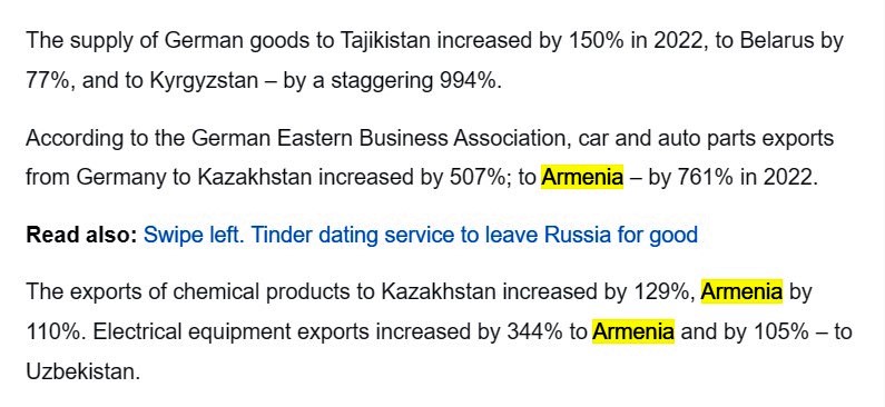 “Bild” nəşrinin araşdırmasına görə, Rusiyaya sanksiyalar tətbiq olunduqdan sonra Almaniyadan Orta Asiya və Ermənistana ixrac 2 dəfədən çox artıb. Həmin məhsulların böyük əksəriyyəti isə Ermənistan vasitəsilə re-eksport sxemi üzrə Rusiyaya çatdırılır. mənbə