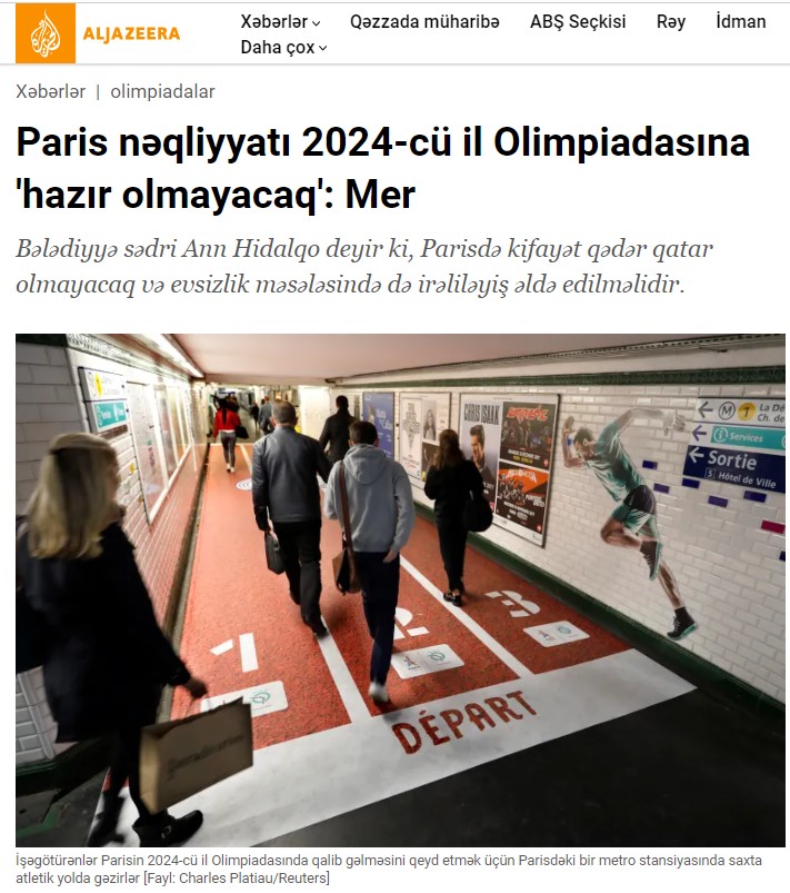 Ancaq Makron hökuməti nəinki bunları etdi, heç Tokio Olimpiadasındakı təminatların yarısını belə qura bilmədi. Parisin meri Anne Hidalqo şəhər nəqliyyatının Olimpiadaya hazır olmadığını ertiraf edib. Hidalqo bildirib ki, hökumətin iqtisadi-sosial problemlərə və digər məsələlərə başı qarışdığından nəqliyyat sisteminin 2024-cü il Olimpiya oyunlarına hazırlamağa vaxtı çatmayıb. Nəqliyyatda həddindən artıq sıxlıq, çirklilik və anti-sosial elementlərin olması haqda məlumatlar hədsiz çox yayılır. istinad