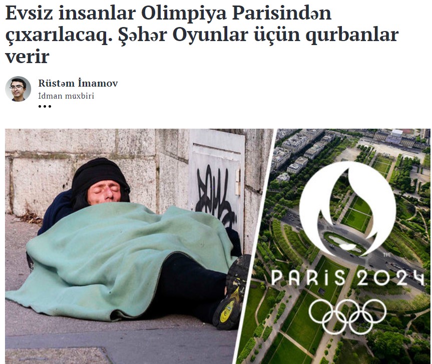 “Paris-2024” Olimpiya Parisdə çətin vəziyyətdə olan evsizlərin vəziyyətini daha da ağırlaşdırıb. Qadınlar körpə uşaqları ilə küçədə qalıblar. İnsanları məcburi olaraq şəhərətrafına köçürürlər və evlər Fransa paytaxtına axın edən turistlərə kirayəyə verilir. Sosial yardım xidməti də körpə uşaqla küçədə qalan qadınlara ev tapa bilmədiklərindən şikayətlənir. Texniki işçilərə şərait yaratmaq üçün tələbələr kampuslardan qovulublar və kirayə qiymətlər isə kəskin yüksəlib.