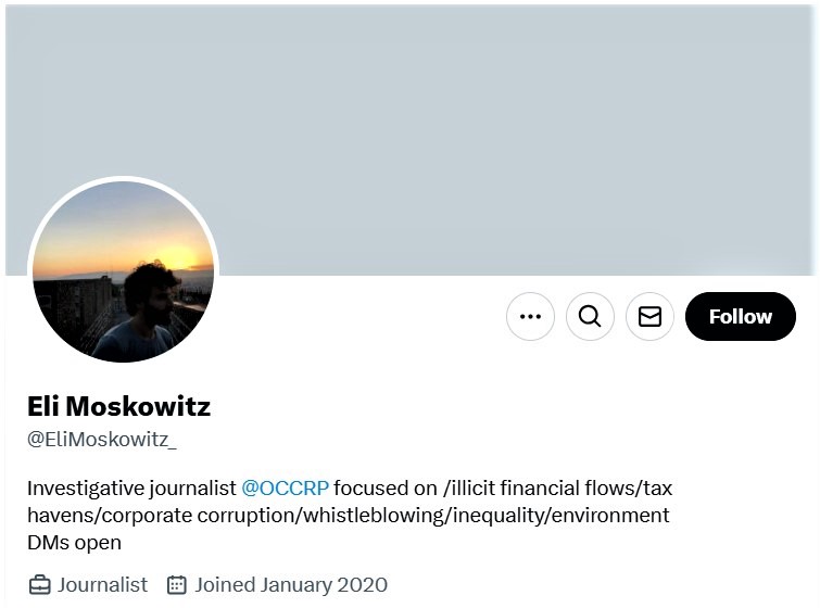 Bu şəxsi araşdırmaq üçün axtarışa verdikdə OCCRP-nin saytından, “linkedIn”-dən, “muckrack”-dan (https://muckrack.com/eli-moskowitz) başqa heç bir yerdə məlumat tapmadıq. Yalnız “X” səhifəsinin mövcudluğu aşkarlandı.