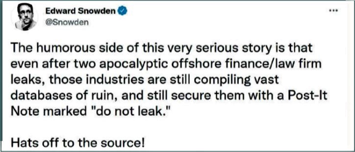 “Pandora sənədləri” açıqlanandan sonra qlobal media cameəsi bu məsələyə Edvard Snoudenin münasibətini öyrənmişdi. E.Snouden bu “qalmaqallara” münasibətini istehza və sarkazmla ifadə edərək demişdir ki, “Bu çox ciddi hekayənin yumoristik tərəfi ondan ibarətdir ki, ofşorlardakı maliyyə/hüquq firmalarından iki apokaliptik sızmadan ("Panama" və "Paradise" nəzərdə tutulur - red.) sonra belə, bu sahələr hələ də nəhəng “məlumat xarabalığını” təşkil edir, onlar hələ də “Sızdırma!” lövhəsi ilə qorunur”.