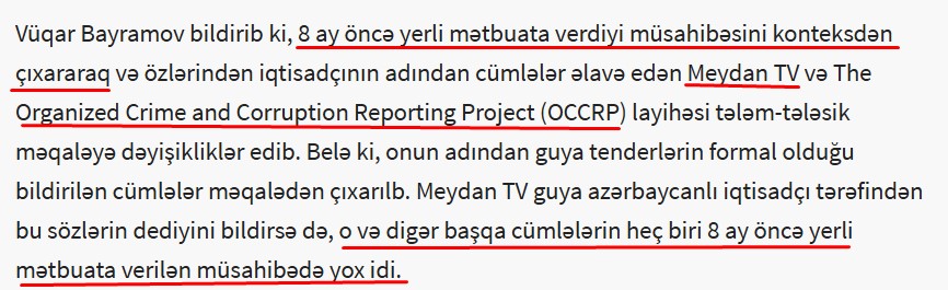 - Bu araşdırmaçı jurnalistika stili deyil: “Azərbaycanın pulyuyan maşını haqda hesabatda isə deyilir ki, Baktelekomun köçürdüyü pulları haradan aldığı məlum deyil. Bunlar hökumətdən, Mərkəzi Bankdan və ya Beynəlxalq Bankdan alınan borclardır? – bilinmir.”