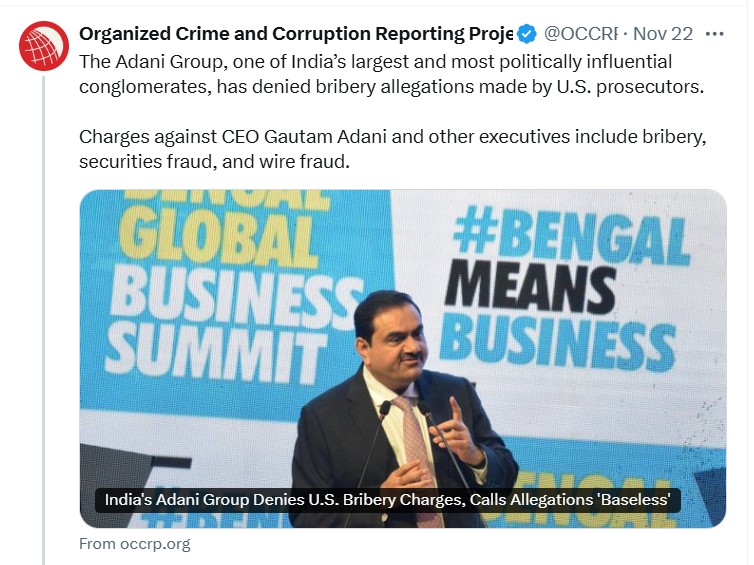 31 avqust 2023-cü il tarixində Hindistanın “India Today” saytında “Corc Soros kimdir və onu “Adani qrup” problemi ilə nə bağlayır” adlı məqalə yayımlanıb. Məqalədə bildirilir ki, “Hindenburg Research” hesabatından 7 ay sonra Corc Sorosun sponsoru olduğu OCCRP təşkilatı da Hindistanın ən böyük və imkanlı investisiya şirkəti olan “Adani Qrup”a qarşı saxta məlumatlarla dolu olan hesabat hazırlayıb. Bu hesabatların nəticəsində şirkət böyük ziyan görüb, aksiyaları dəyərdən düşüb. Bu hücumların səbəbi kimi Corc Sorosun Hindistanda həyata keçirmək istədiyi destruktiv fəaliyyətə qarşı “Adani Qrup”un rəhbəri Qautama Adaninin “ipə-sapa yatmaz” mövqeyi göstərilir. Məqalədə OCCRP və Soros əlaqələri haqda da danışılır. Bu misalı çəkməkdə məqsədimiz OCCRP-nin sifarişlə şantajçı mövqe tutmasını bir daha göstərmək idi.