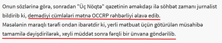 Bu OCCRP-nin saxtakarlığının, qərəzli olmasının, təhriflərə yer verməsinin ilk və sonuncu halı deyil. Məsələn, “Azərbaycan pulyuma maşını” “Pandora sənədləri”ndə bütün çərçivələr aşılaraq, hədsiz çox saxta məlumatlara, dolğun olmayan faktlara, qondarma ittihamlara rast gəlinib. Bir neçəsini xatırladaq: