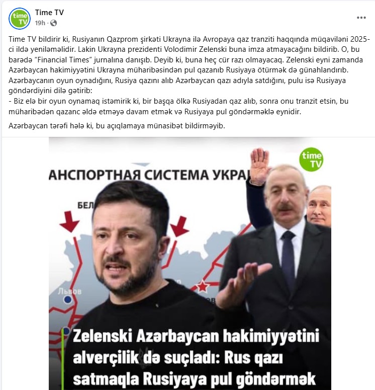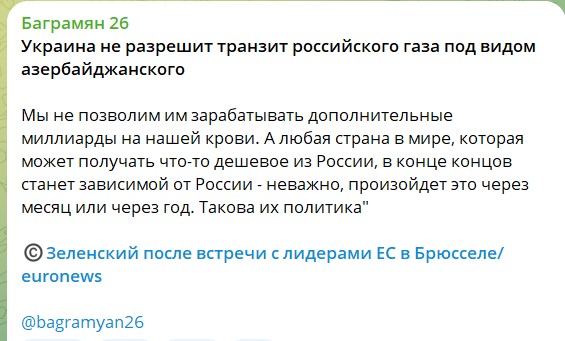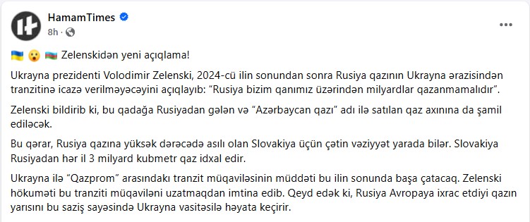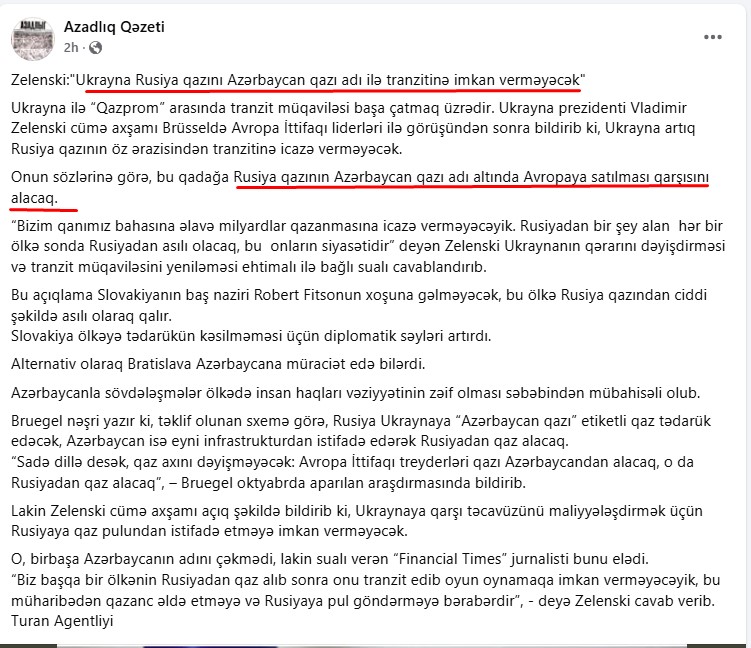 - V.Zelenski “Ukrayna Rusiya qazını Azərbaycan qazı adı ilə tranzitinə imkan verməyəcək" ifadəsini işlətməyib;