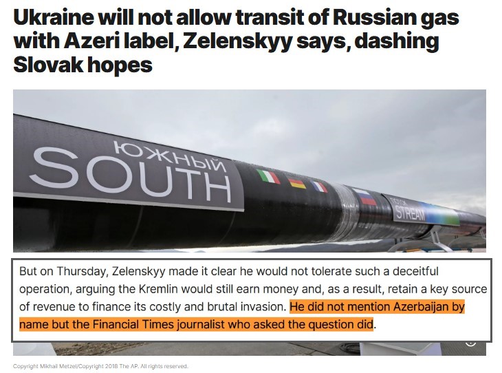 Zelenski isə cavabında (5:00‒6:54-cü dəqiqələr) “Azərbaycan” sözünü bir dəfə də dilə gətirmədən, məlum cavabları verir. Zelenskinin “Azərbaycan” sözünü işlətmədiyini, bunu yalnız “Financial Times” qəzetinin əməkdaşının səsləndirdiyini “Euronews”-da dərc edilən “Zelenski Ukraynanın Azərbaycan “markalı” “Rusiya qazı”nın tranzitinə icazə vermədiyini açıqladı və Slovakiyanın bütün ümidlərini qırdı” məqaləsində də qeyd olunub.