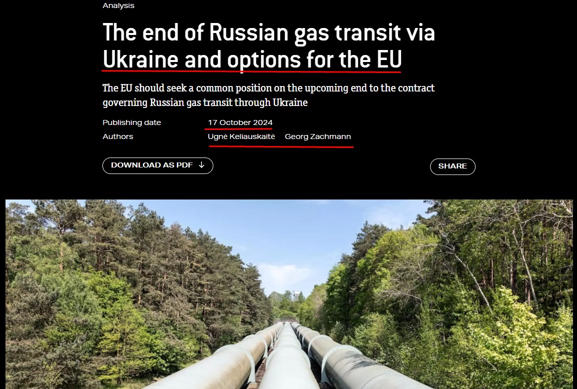Həmin arayışda Rusiya qazının Ukrayna ərazisindən tranzit yolu ilə ötürülməsi ilə bağlı müqavilənin sona çatdığı, Ukraynanın bu müqaviləni uzatmayacağı qeyd olunur. Bundan başqa Ukrayna ərazisindən ötürülən “Rusiya qazı”nın illərə görə həcmi, dəyəri haqda müfəssəl məlumat verilir. Məqalədə Avropa İttifaqı üçün 3 variant-ssenari təklif edilir. O ssenarilərdən yalnız biri Azərbaycanla bağlıdır. Təklif olunan 2-ci varianta (ssenariyə) görə, Ukrayna üzərindən keçən “Rusiya qazı”nın “Azərbaycan qazı” ilə əvəz olunmasını nəzərdə tutur.