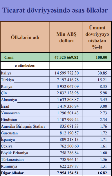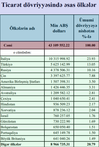 Ticarət dövriyyəsində ayrıca hər bir ölkənin payına gəldikdə, ilk yerdə Aİ-nin əsas iqtisadi güclərindən biri olan İtaliya gəlir. Sonrakı yerlərdə Türkiyə, Rusiya, Çin, ABŞ, Almaniya, Avstraliya, Çexiya, Hindistan, Xorvatiya, İsrail, Gürcüstan, Bolqarısatn, Portuqaliya, Böyük Britaniya və s. ölkələr qərarlaşır. Yəni ilk 15-likdə yer alan dövlətlərin 9-u Qərb ölkələridir. Türkiyə, Rusiya və Çin istisna olmaqla (hər 3 ölkə Azərbaycanın illərdir ki, ənənəvi ticari patnyoru, əsas bazar iştirakçısıdır) digər ölkələr də Azərbaycanla 20 ildən artıqdır ki, eyni dinamika üzrə iqtisadi əlaqaləri davam etdirir. (Mənbə: Azərbaycan Respublikası Dövlət Gömrük Komitəsi. Xarici Ticarətinin Gömrük Statistikası. 01.01.2024 – 30.11.2024. Səh 6-28 )