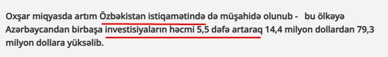 “Toplum TV-nin Azərbaycandan Özbəkistana birbaşa investisiyaların həcminin 5,5 dəfə artaraq 14,4 milyon dollardan 79,3 milyon dollara yüksəlməsi barədə deyilənlər də birtərəfli və qərəzli yanaşmaya, savasızlıqdan doğan mühakiməyə əsaslanır.