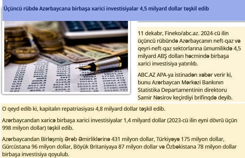 İkincisi, Azərbaycana xarici ölkələr tərəfindən hər il milyard dollarla sərmayə yatırılır və ölkəyə daxil olan investisiya ölkədən çıxan sərmayəni üstələyir. Məsələn, 2024-cü ilin üçüncü rübündə Azərbaycanın neft-qaz və qeyri-neft-qaz sektorlarına ümumilikdə 4,5 milyard dollar həcmində birbaşa xarici investisiya yatırılıb ki, bu göstərici ilə Azərbaycandan xaricə çıxan investisiyaları (1,4 milyard dollar) 3 dəfədən çox üstələyib. Bu dövrdə kapitalın repatriasiyası, yəni geri dönüşü 4,8 milyard dollara bərabər olub. Yəni müxtəlif əməliyyatlar və köçürmələr üzrə kapitalın geri qayıdışı da xeyli artıb. istinad