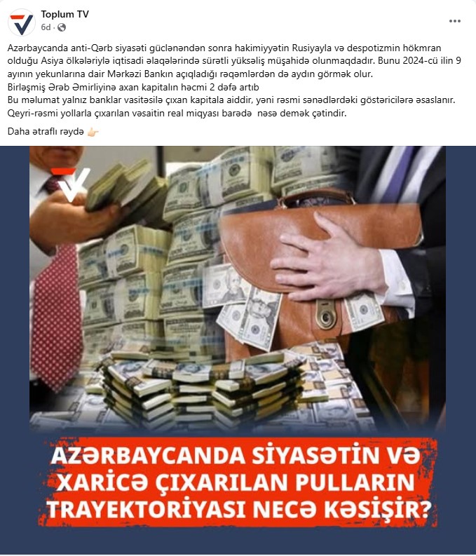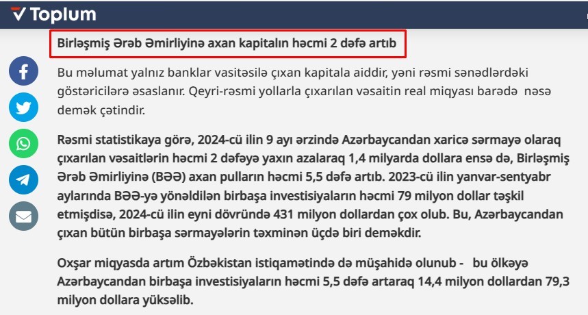 “Toplum TV”nin iddiasına görə, Azərbaycandan son bir ildə xarici ölkələrə, xüsusilə də Asiya və körfəz dövlətləri istiqamətinə yönələn kapital axınlarının həcmi artıb. “Rəsmi statistikaya görə, 2024-cü ilin 9 ayı ərzində Azərbaycandan xaricə sərmayə olaraq çıxarılan vəsaitlərin həcmi 2 dəfəyə yaxın azalaraq 1,4 milyarda dollara ensə də, Birləşmiş Ərəb Əmirliyinə (BƏƏ) axan pulların həcmi 5,5 dəfə artıb. 2023-cü ilin yanvar-sentyabr aylarında BƏƏ-yə yönəldilən birbaşa investisiyaların həcmi 79 milyon dollar təşkil etmişdisə, 2024-cü ilin eyni dövründə 431 milyon dollardan çox olub”.