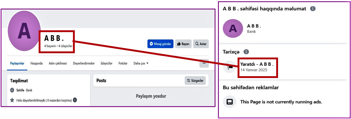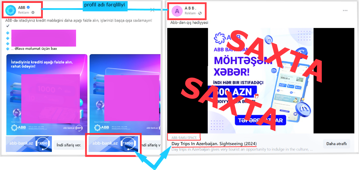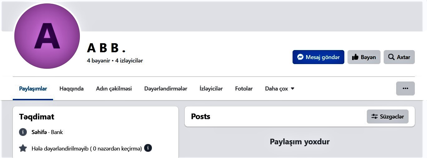 2. Bankın rəsmi səhifəsinin adı “mavi tıkla” “ABB” kimi, saxta profil isə “A B B.” ilə yazılıb. Bundan başqa rəsmi səhifədə elanda bankın saytı abbbank.az, saxta səhifədə naməlum (hələlik) “abb-baku.space” linki görünür.
