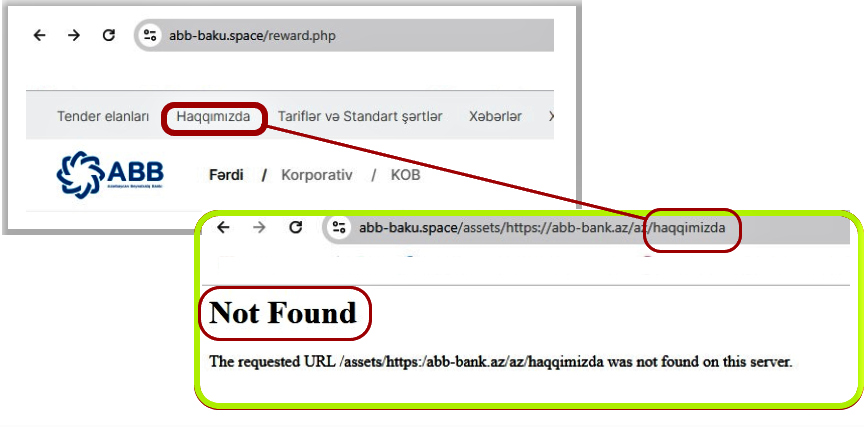 Abb-Baku.space linkinə tıkladıqda əsas səhifədə ABB abreviaturası və bir neçə alt qrupların düymələri görünür. Həmin düymələrdən istənilən birinə sıxdıqda səhifənin tapılmaması haqda mesaj göndərilir: