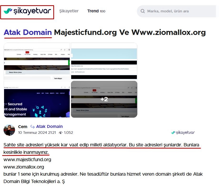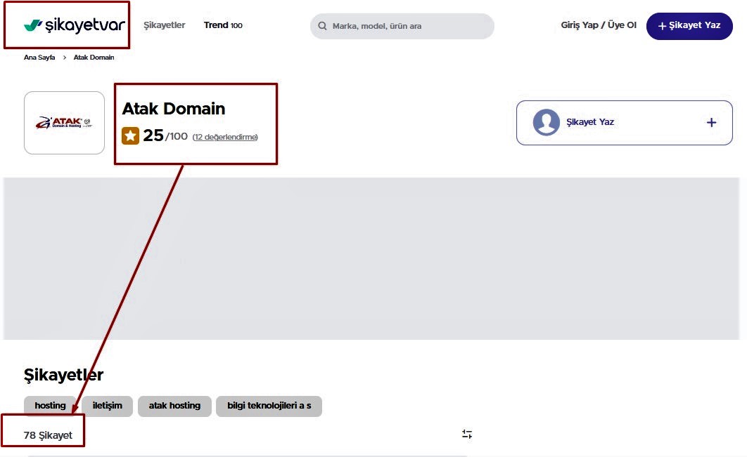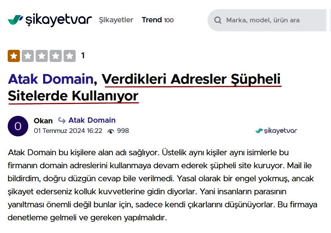Domen və hostinq satışı ilə məşğul olan “Atak Domain Bilgi Teknolojileri A.Ş”. şirkəti ilə bağlı araşdırma apardıqda Türkiyənin məşhur istehlakçı hüquqlarının müdafiəsi saytı “Şikayətim var”-da 78 şikayətçinin olduğunu görürük.