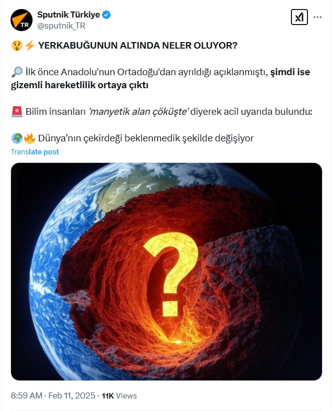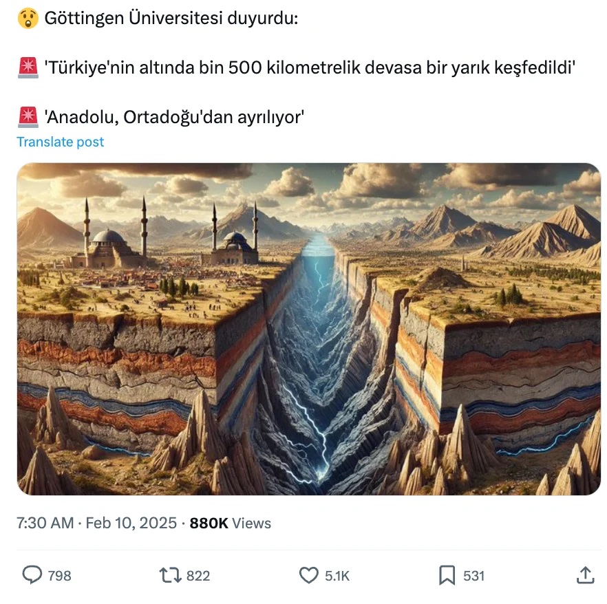 Sosial mediada yayılan paylaşımda Türkiyənin altında nəhəng çat olduğu iddia edilib. İddialara görə, məlumatın mənbəyi Göttingen Universitetində aparılan araşdırmadır.