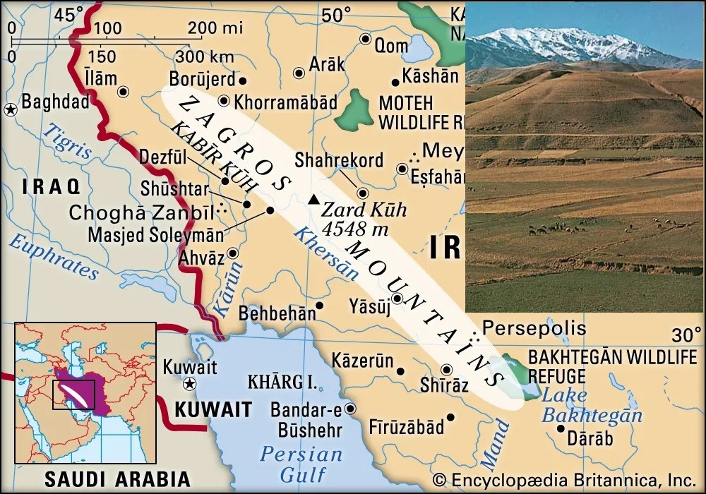 Zaqros dağları yer qabığını təşkil edən plitələrdən olan Ərəbistan və Avrasiya plitələrinin toqquşması nəticəsində yaranmışdır. Çökmüş quru səthi “Mesopotamiya” adlanan bölgəni təşkil edir. Bu bölgədə Neogen dövründə təxminən 3-4 km qalınlığında çökəkliklər və çöküntü təbəqələri yığılıb.