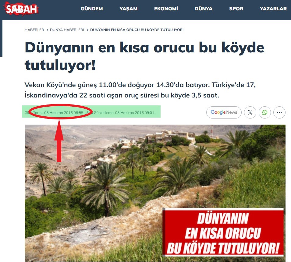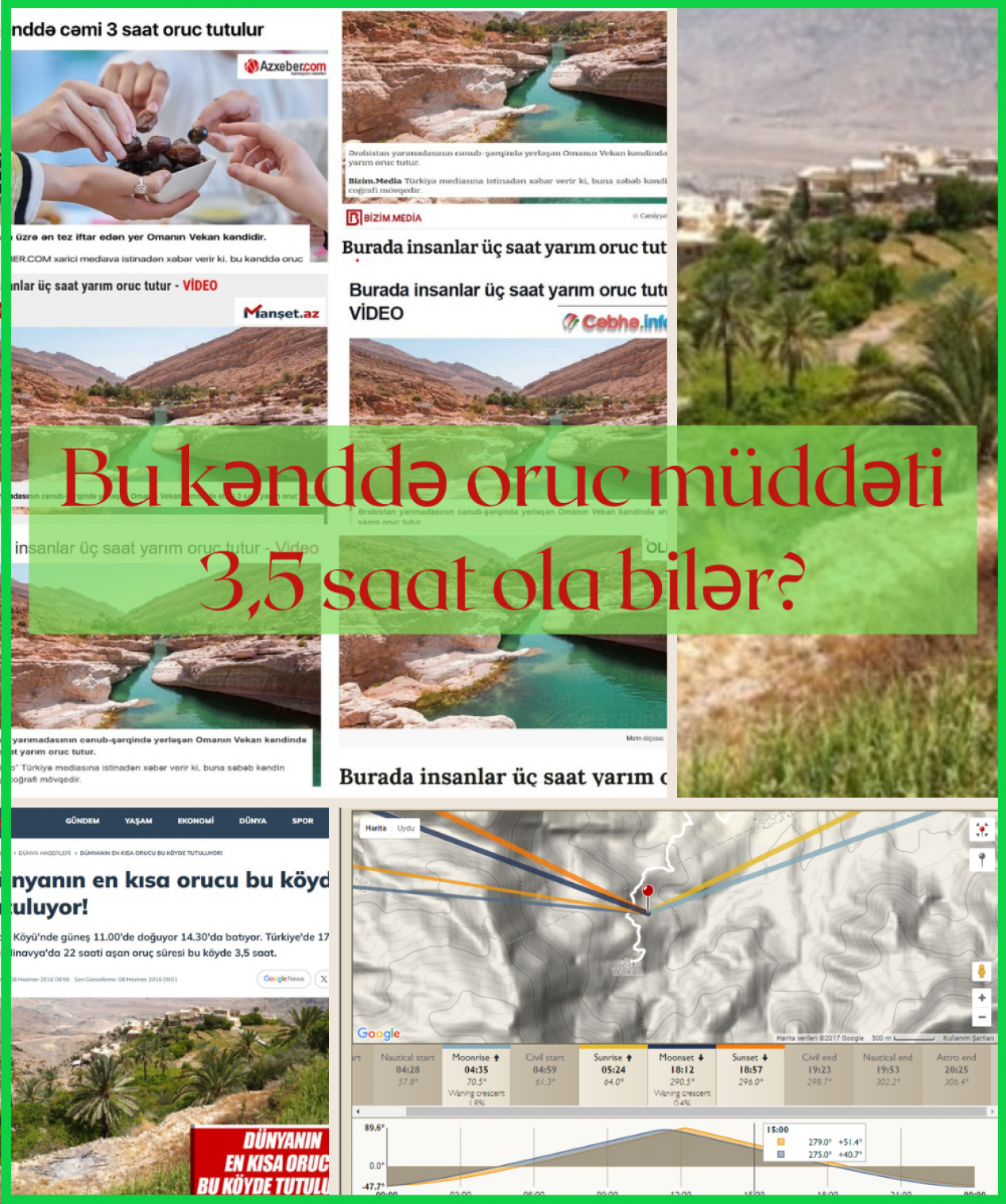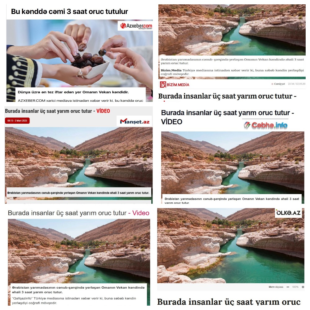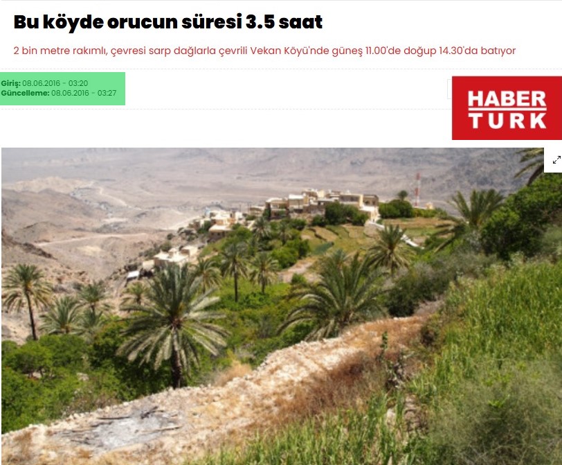 Azərbaycan mediasında əksər saytlar Türkiyə mediasına istinadən Ərəbistan yarımadasının şərqindəki Omanın Vakan kəndində insanların gündə 3,5 saat oruc tutması ilə bağlı xəbər paylaşıblar.