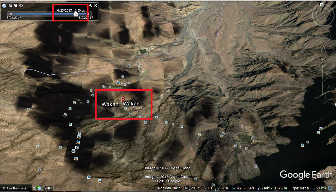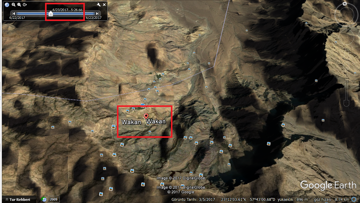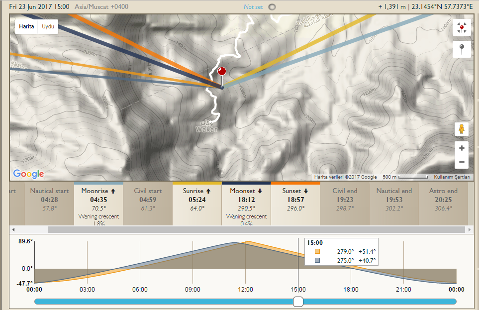 Bu məlumatı “Google Earth” ilə də yoxlamaq mümkündür. Yenə Vakanın koordinatlarını “Google Earth”ə daxil edərək araşdırdıqda günəşin 23 iyun 2017-ci il tarixində saat 05.26-da doğduğu və saat 19.00-da batdığı görülür.