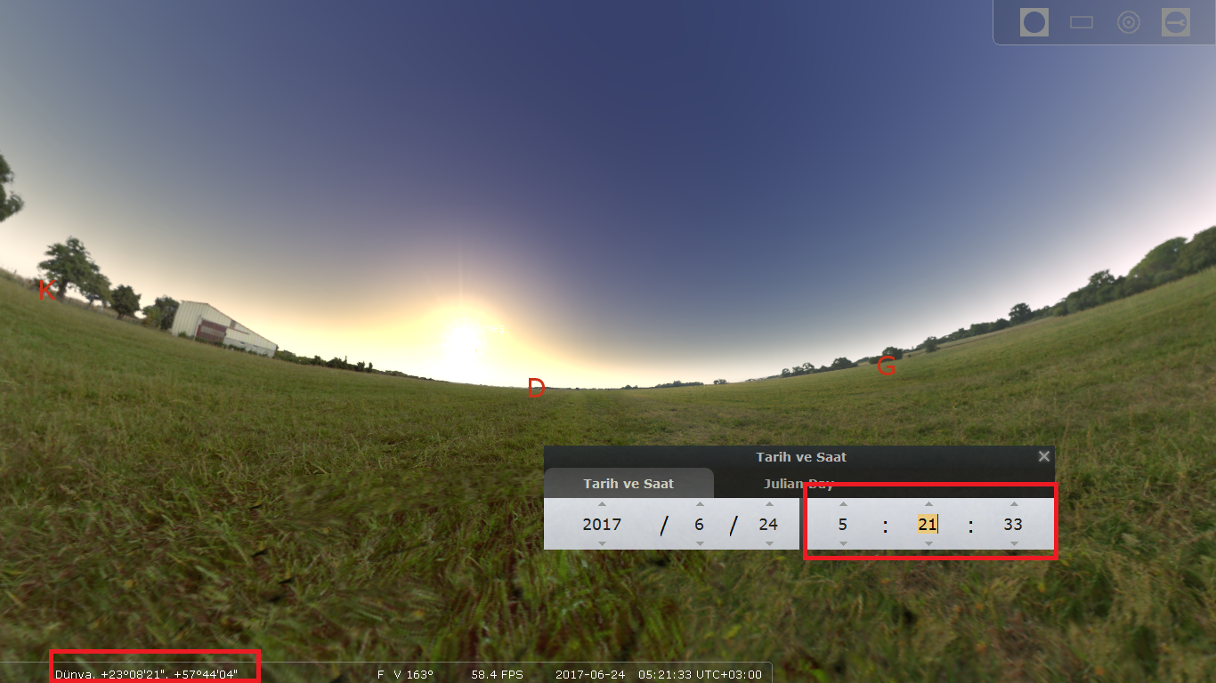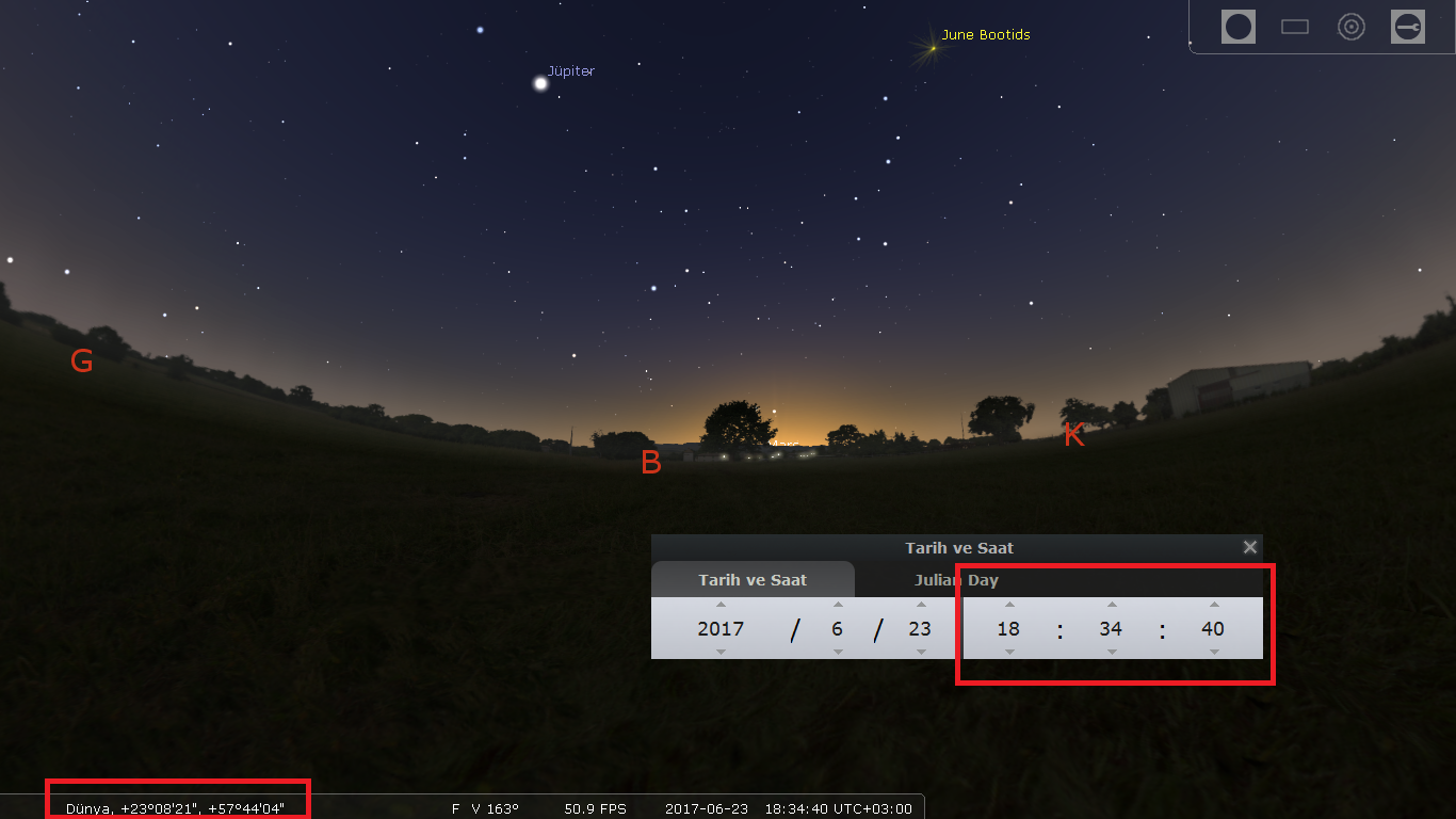 Nəhayət, yuxarıdakı məlumatları ulduzları seyr edənlər, astronomlar və fotoqraflar tərəfindən istifadə edilən və ulduzlardan planetlərə qədər bir çox göy cisimlərinin müşahidə oluna biləcəyi “Stellarium” adlı proqramla yoxlamaq mümkündür. Vakan kəndinin koordinatları “Stellarium”a daxil edildikdə, Günəşin doğuş və qürub vaxtlarının qeyd olunanlarla demək olar ki, eyni olduğunu görmək olar. Səhər saat 05.21 radələrində Günəşin şərqdən doğduğu və axşam saat 18.34 radələrində batmaq üzrə olduğu aydın görünür.