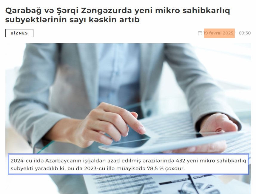 Həmçinin, işğaldan azad edilmiş ərazilərdə iş yerlərinin sayında böyük artımlar müşahidə edilməkdədir. Belə ki, səhifənin 2024-cü ildə Ağdamda 49, Laçında 37, Kəlbəcərdə 72 iş yerinin qapadılması barədə məlumatı bölgədə iş yerlərinin dinamikasını gözdən salmağa xidmət edir. 2024-cü ildə Azərbaycanın işğaldan azad edilmiş ərazilərində təkcə 432 yeni mikro sahibkarlıq subyekti yaradılıb ki, bu da 2023-cü illə müayisədə 78,5 faiz çoxdur. Ölkə üzrə mikrosahibkarlıq subyektlərinin sayının artmasında bu ərazilərdə dinamika daha böyük olub. Qarabağ iqtisadi rayonunda digər biznes və fərdi biznes təsərrüfatlarının sayı 3984 (7,3 faiz çox), Şərqi Zəngəzur iqtisadi rayonunda isə 882 (22,3 faiz çox) mikro sahibkarlıq subyekti təşkil edib. Ümumilikdə, 1 yanvar 2025-ci il tarixinə işğaldan azad olunmuş ərazilərdə iri, orta, fərdi və mikrosahibkarların cəmi 100 min 039-a bərabər olub. Bu, əvvəlki ilin göstəricisini 6,5 faiz üstələyib. (mənbə)