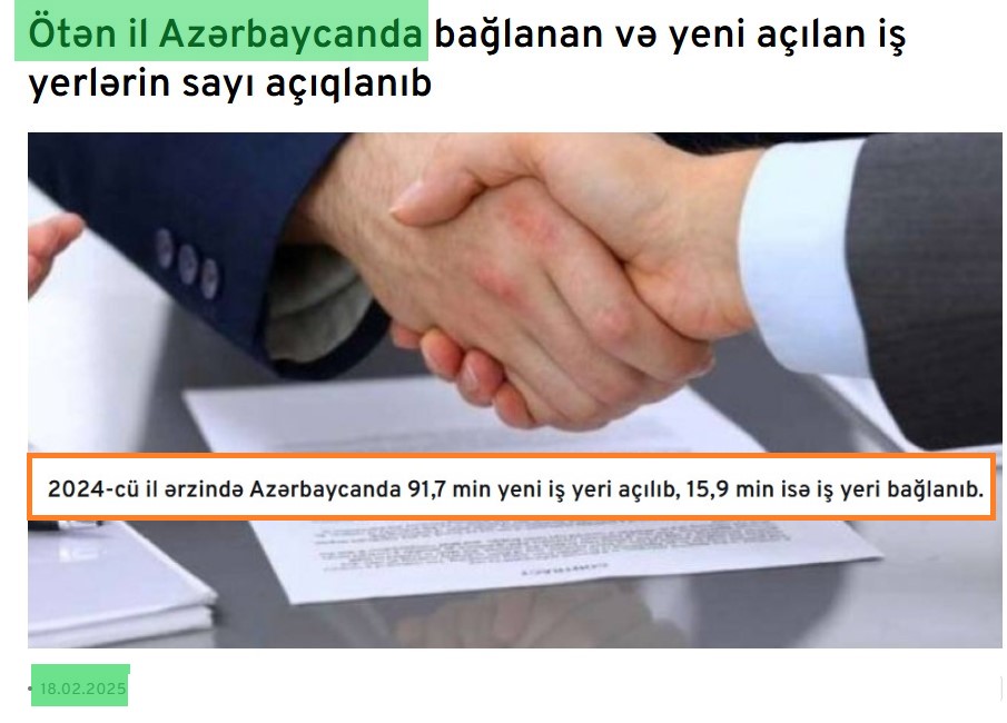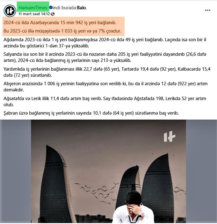 - İddia edilən məlumatlar və əks etdirilən rəqəmlərin heç biri 2024-cü ildə Azərbaycanda iş yerlərinin sayının azalması barədə reallığı əks etdirmir;