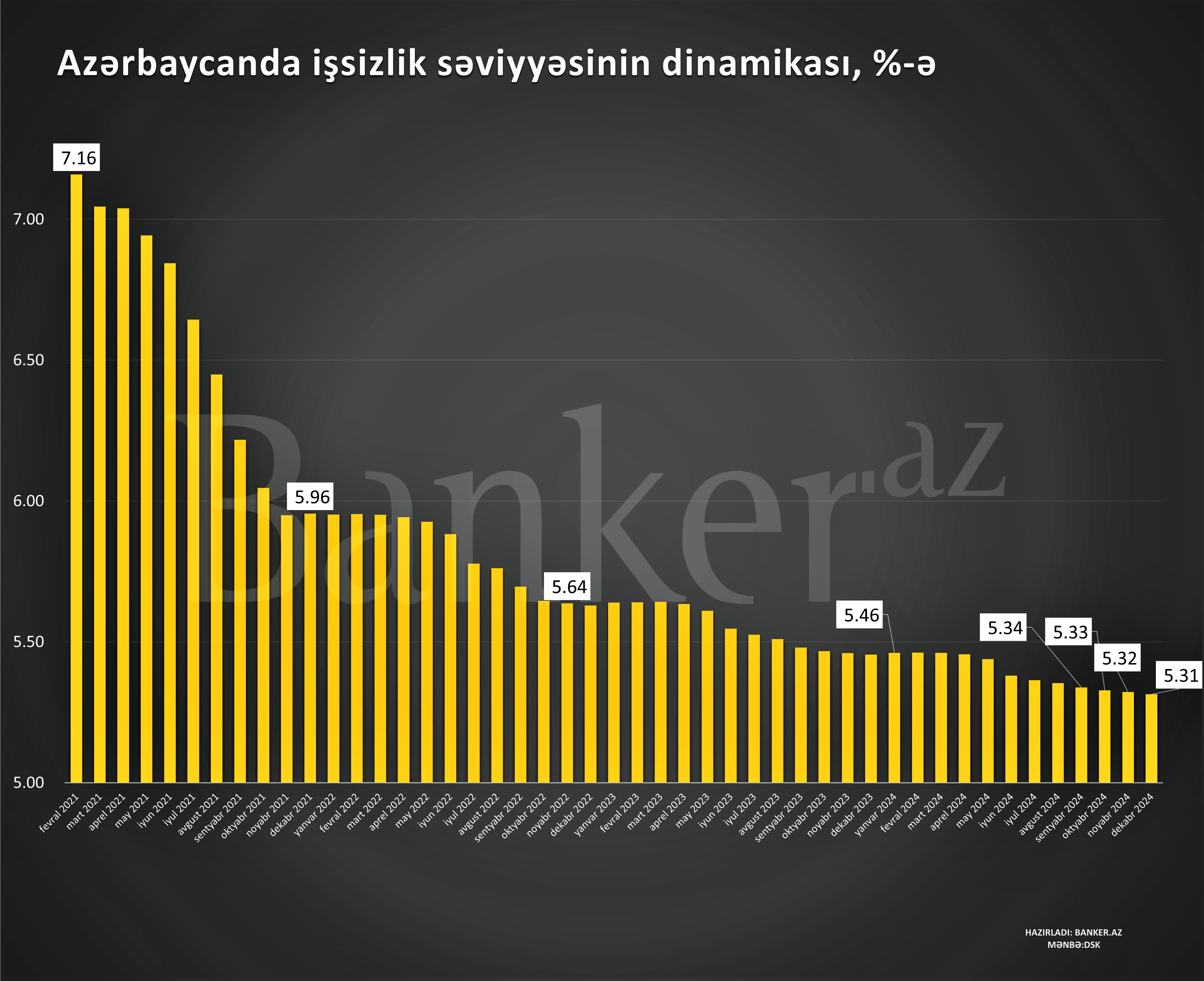 2025-ci il yanvarın 1-nə olan ilkin məlumatlara əsasən, Azərbaycanda işsizlərin sayı 282,3 min nəfər olub. İşsizlik səviyyəsi 2024-cü ilin son ayında yuvarlaq olaraq 5.3 faizdə sabit qalıb. Həmin göstərici artıq 5 aydır ki, bu səviyyədədir. Bununla da işsizlik səviyyəsi son bir ildə 0.14 faiz bəndi azalmış olub. (mənbə)