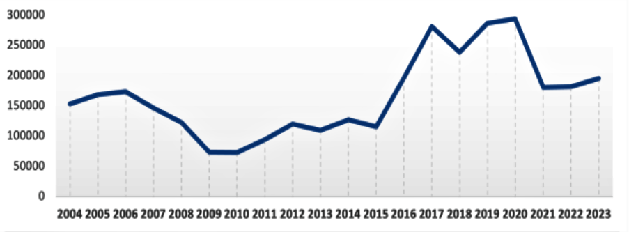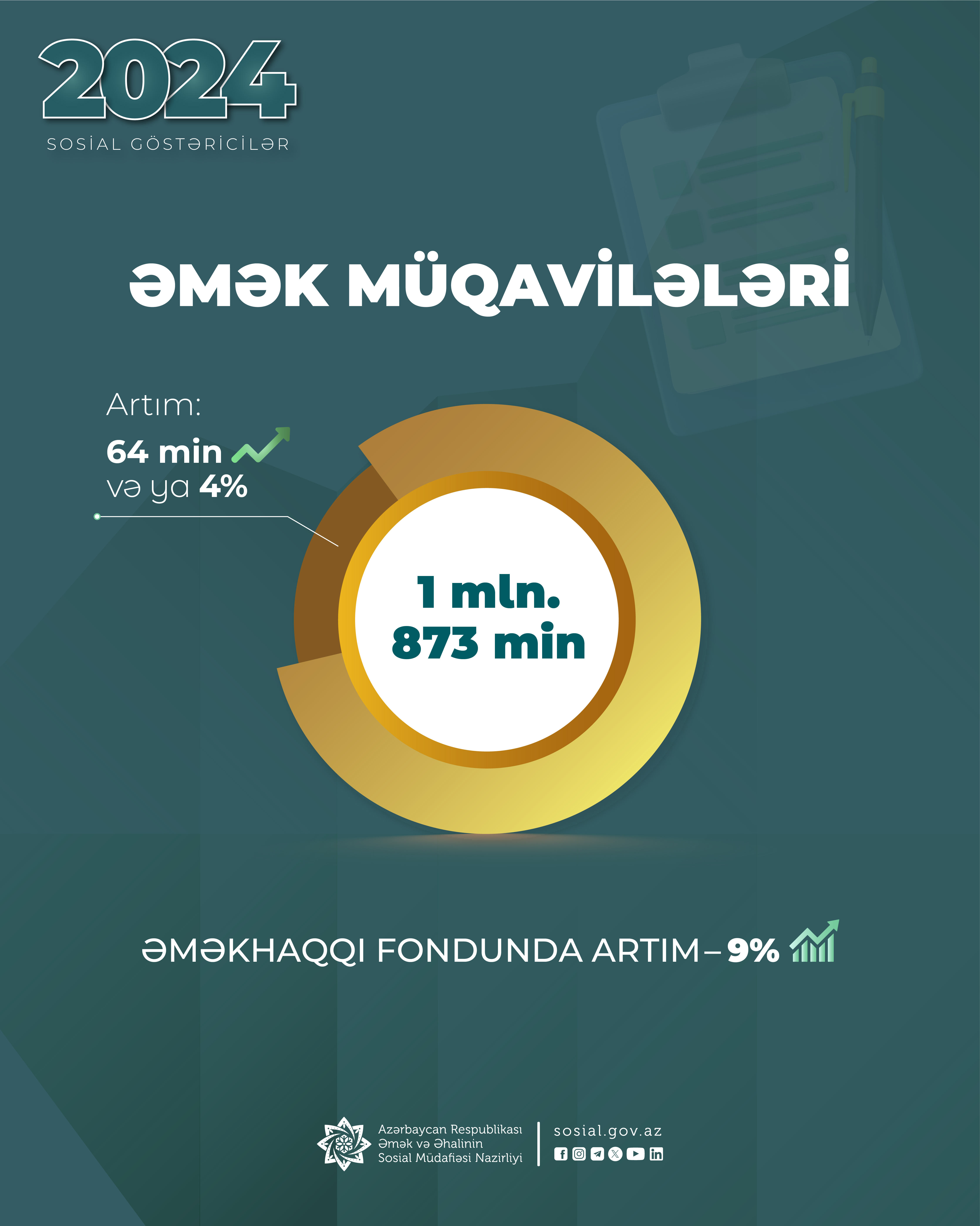 Ölkədə əhalinin iş yerləri ilə təminolunma və məşğulluq səviyyəsinin əsas göstəricilərndən biri də əmək müqavilələrinin sayı ilə bağlıdır. Bu müqavilələr faktiki olaraq hər il yeni qeydə alınan işçilərin rəsmi sayının göstəricisidir. 2024-cü ilin yekununda ölkə üzrə əmək müqavilələrinin sayı 64 min artaraq 1 milyon 873 minə çatıb. Bu, əvvəlki ilə nisbətən 4 faiz artım deməkdir.