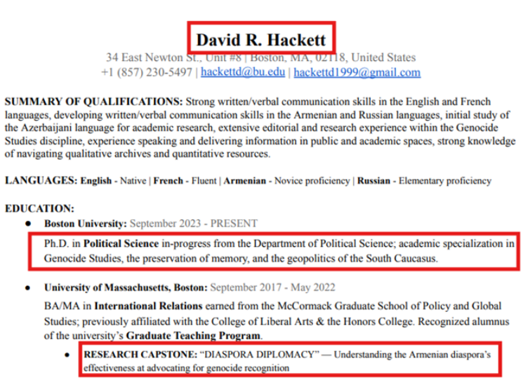 Araşdırma nəticəsində öyrəndik ki, David Haketin ixtisası “Soyqırım tədqiqatları, yaddaşının qorunması və Cənubi Qafqazda geosiyasət”dir. Akademik fəaliyyətinin kulminasiyası isə belə adlanır: “DİASPOR DİPLOMATİYASI - Erməni diasporasının soyqırımının tanıdılması sahəsində apardığı təbliğatın effektivliyi”.