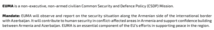 Bəs bu elmi araşdırmaçının, doktorantın Ermənistan- Azərbaycan şərti sərhəddində, missiyasının sərhəd patrulunda nə işi var? EUMA-nın rəsmi mandatına əsasən, missiya yalnız Aİ vətəndaşlarından ibarətdir və funksiyası isə sadəcə “müşahidə etmək və hesabat vermək”dir.