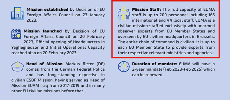 2025-ci ilin fevral ayında EUMA-nın “LinkedIn” səhifəsində Ermənistan və Azərbaycan şərti sərhədində biri mülki geyimdə, digəri isə Aİ missiyasının ənənəvi göy qısaqol gödəkcəsində olan 2 nəfərin foto görüntüsü yayıldı.
