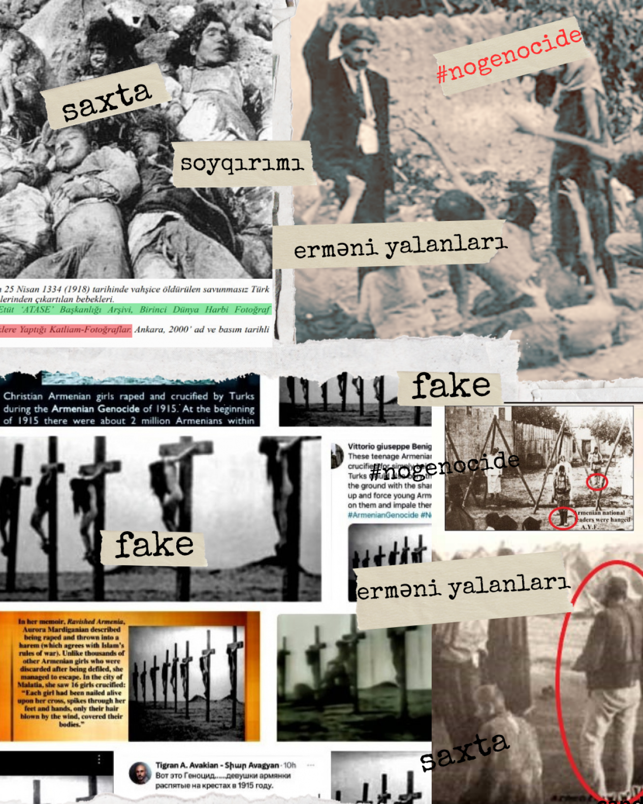 Saxtakarlıq 2. Bundan başqa erməni siyasətçiləri, diplomatları, jurnalistləri və sosial şəbəkə istifadəçiləri tez–tez qondarma “erməni soyqırımı” ilə əlaqəli olduğu iddia edilən bu fotonu da paylaşırlar. Foto “Çarmıxa çəkilmiş qadınlar” adlanır, bu fotoya sosial mediada daha çox rast gəlinir.