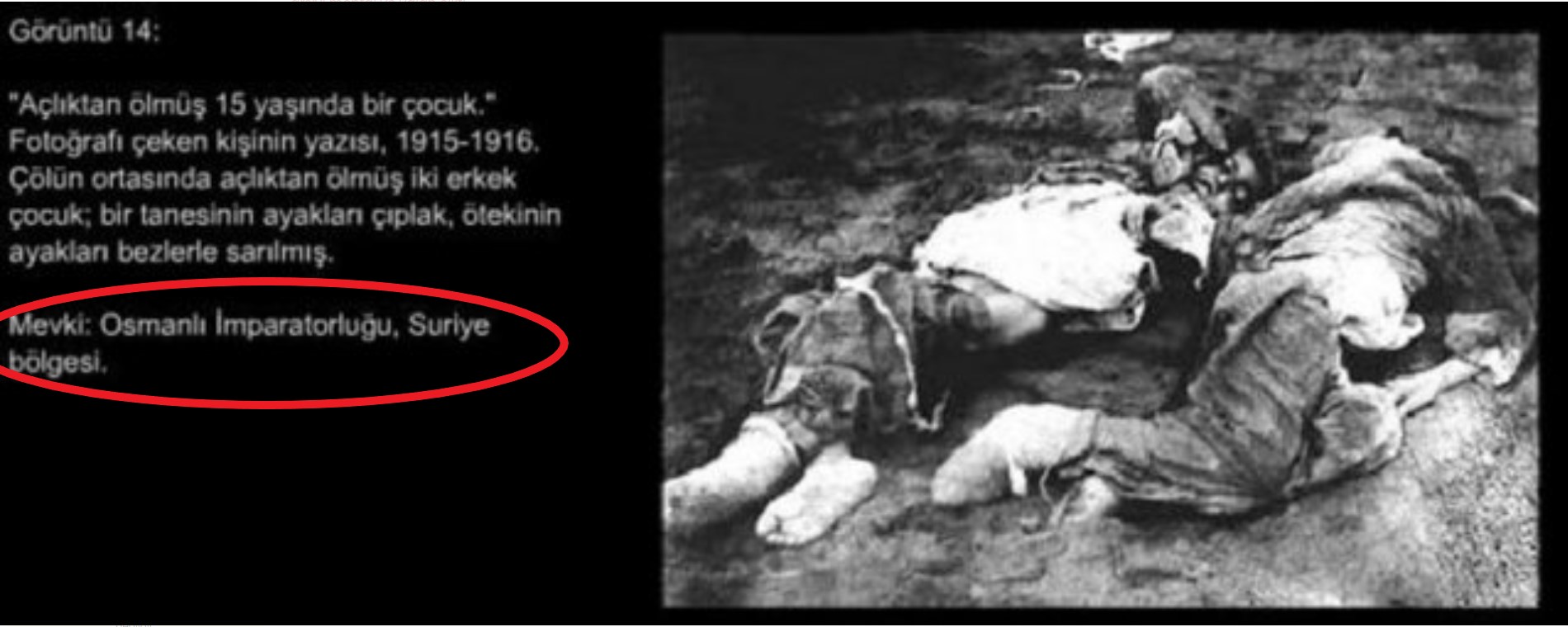 Bu fotonun saxtalığını müəyyən etmək üçün həlak olmuş qadının ayaqlarındakı uzunboğaz corablara diqqət yetirmək kifayətdir. 100-110 il bundan öncə nəinki Kiçik Asiyada, heç Avropada da qadınlar belə uzunboğaz corablar geyinmirdilər. Bu corablar yalnız II Dünya Savaşına yaxın dövrlərdə dəbə minmişdir.