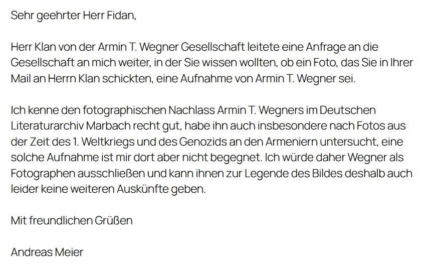 Armin T. Veqnerin “Alman ədəbiyyatı Marbax” əsərindəki foto irsini çox yaxşı bilirəm. Mən özüm də I Dünya Müharibəsindən sonra həmin qırğınların şəklini axtardım, amma belə bir şəkil tapa bilmədim. Və bilirəm ki, Armin T. Wegner bu şəkli çəkməyib və bu şəklin haradan gəldiyi barədə məlumat verə bilmərəm. Hörmətlə, Andreas Meier"