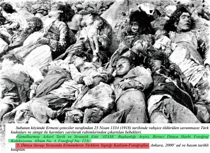 Əslində isə bu foto Qarsın Subatan kəndində erməni quldur dəstələri tərəfindən 25 aprel 1918-ci ildə qətlə yetirilmiş türk sakinlərdir. Foto cinayət işinin sənədlərindən götürülüb və hazırda türkiyə Müdafiə Nazirliyinin Baş Qərargahının arxivində saxlanılır.