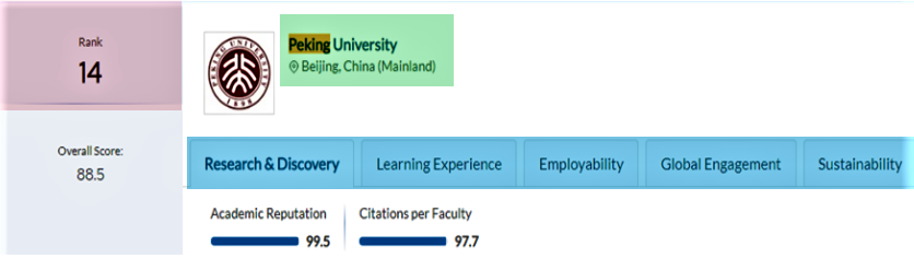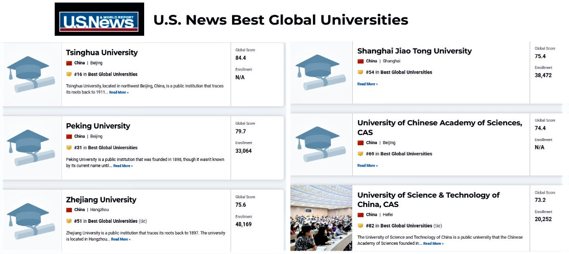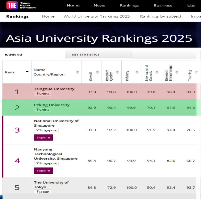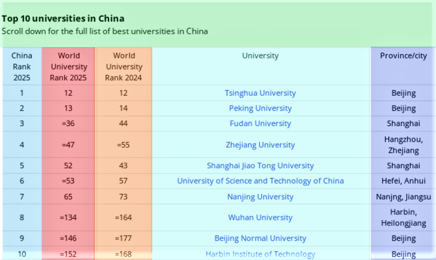 Əvvəlcə, onu qeyd etməliyik ki, Çin Xalq Respublikasındakı 10 universitet “Times Higher" Dünya universitetləri Təhsil reytinqi” (THE,  Times Higher Education World University Rankngs) 2025-ə əsasən ilk 160-a daxildir və bunlardan ikisi 12, 14-cü yerləri tuturlar. timeshighereducation