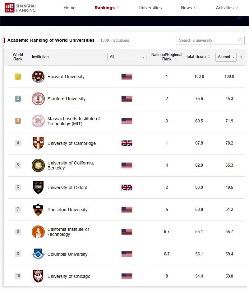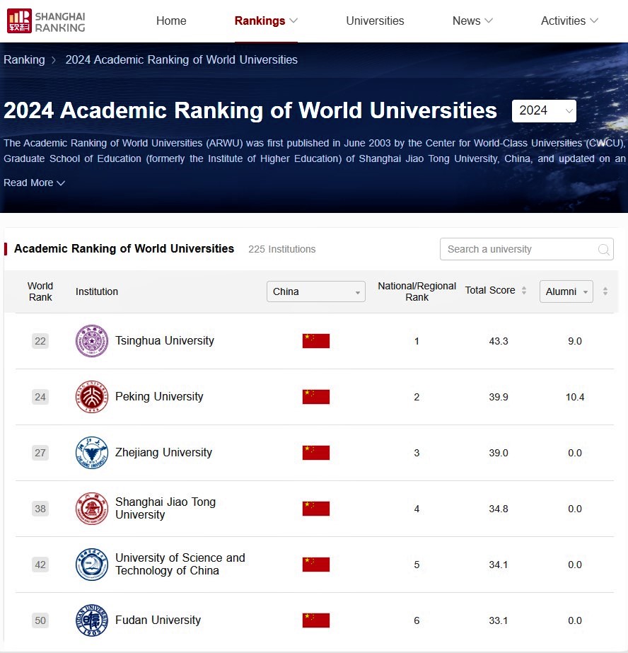 Universitet reytinqlərini müəyyən edən digər bir metodologiya Şanxay Dünya Universitetlərinin Akademik Reytinqi (ARWU- Academic Ranking of World Universities) adlanır. Adının Çinin Şanxay şəhəri ilə eyni olması heç də öz universitetlərinin daha çox irəli çəkilməsi anlamına gəlmir. Bu, ARWU-nun 2024-cü il üçün bütün dünya universitetləri ilə bağlı hazırladığı reytinq cədvəlidir.